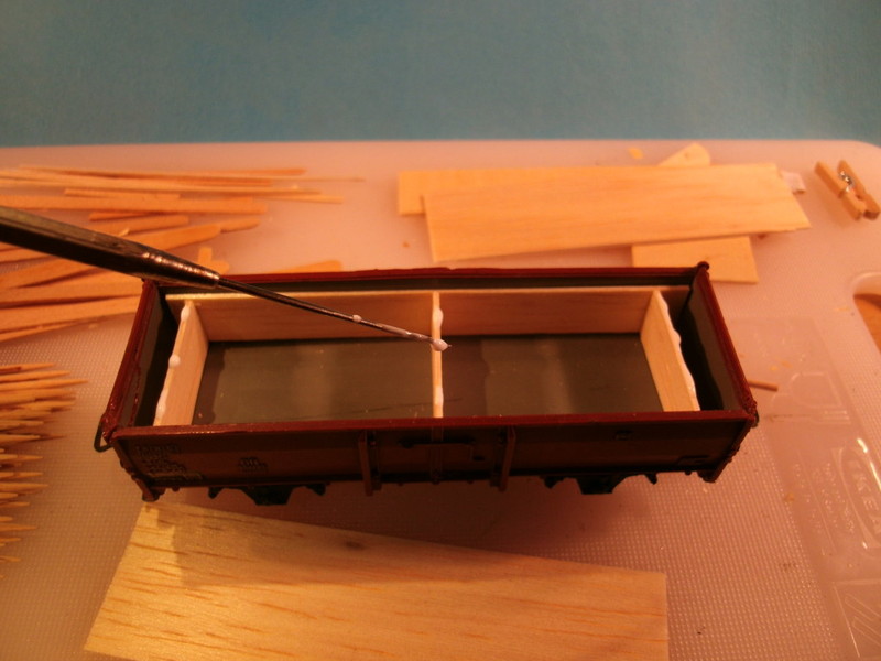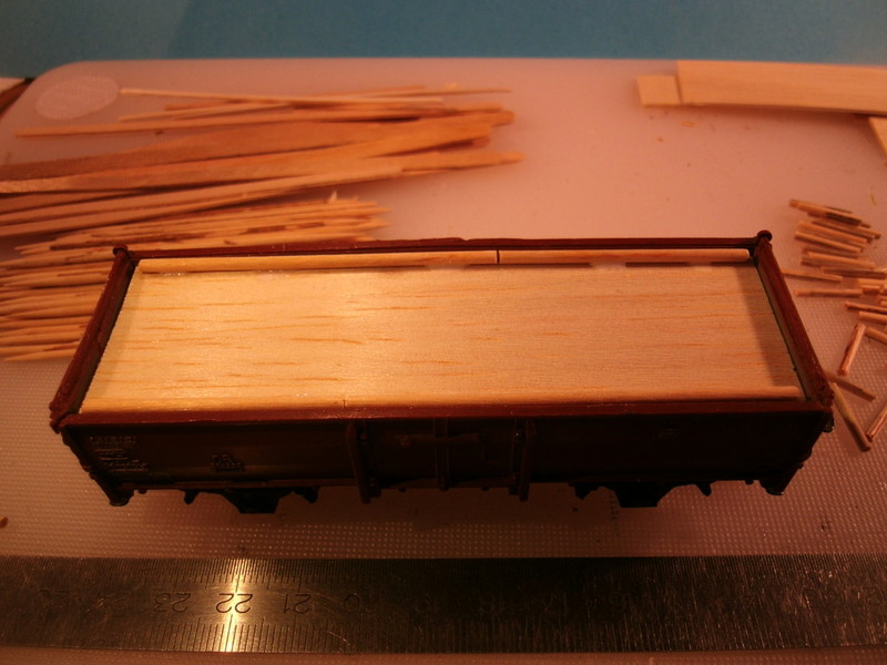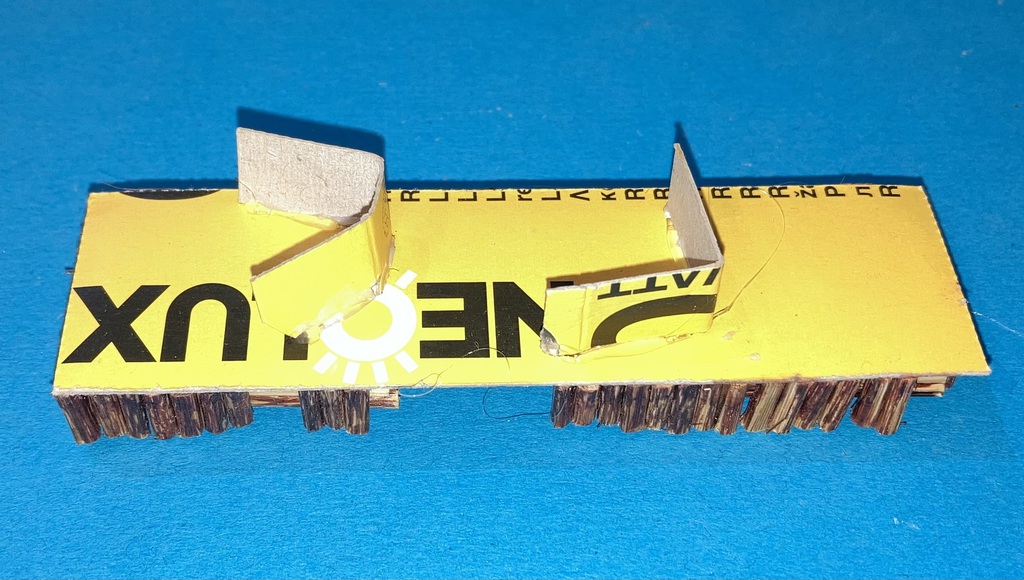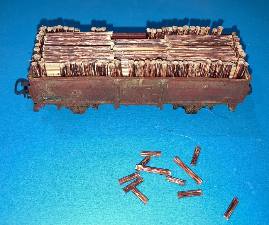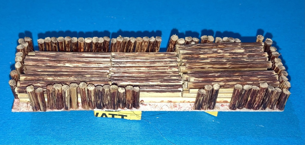 Die Basis bietet ein Balsaholz-Unterbau. Seitlich an der Bordwand liegen Zahnstocher, um die V-förmige Anordnung zu erhalten. Stirnsetig stehen 4 Stämme, um die Ladung zu sichern.