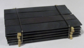 Die Eisenkerne von Ladegeräte-Trafos kann man mit etwas Aufwand demontieren. Man erhält dann die E-Bleche und Rechteck-Bleche. Die rechteckigen Bleche habe ich mit einer Gasflamme ausgeglüht, so dass eine Oxydschicht ersteht die der Walzhaut von z. B. Stahl-Brammen sehr ähnlich ist.