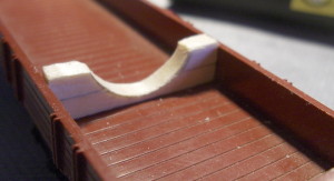 Das Streichholz wird 4x auf Länge geschnitten. Je zwei Hölzer übereinandergeklebt und entsprechend dem Rohrradius ausgefräst.