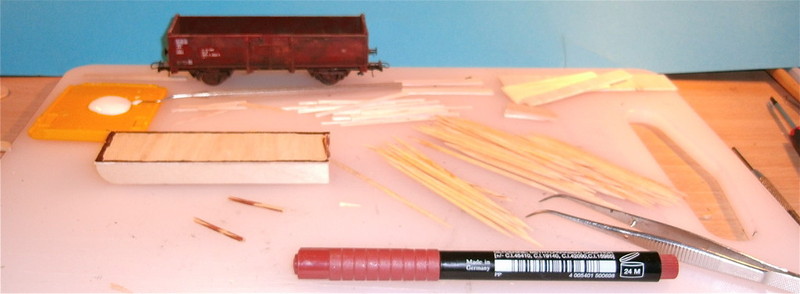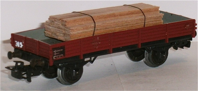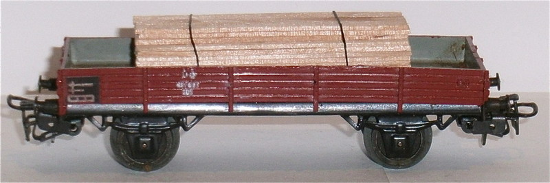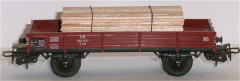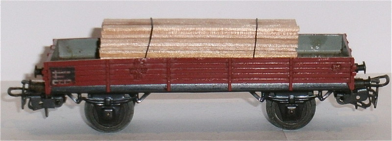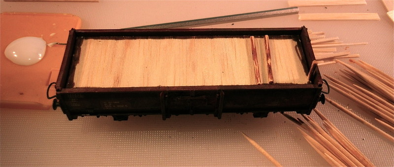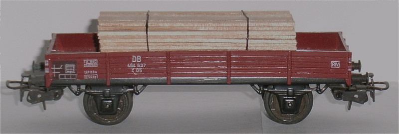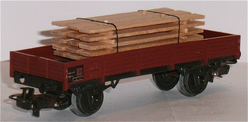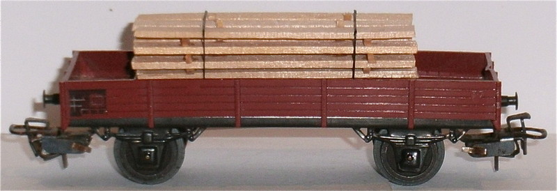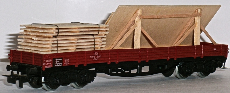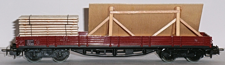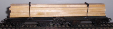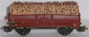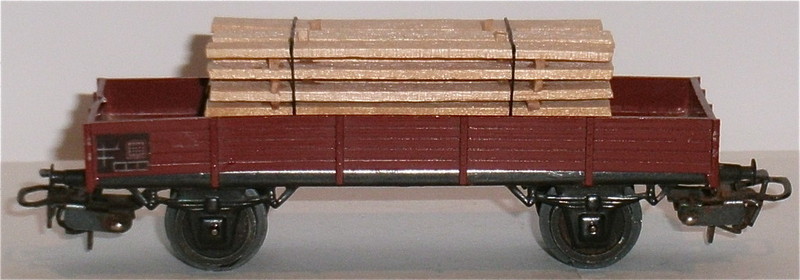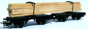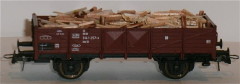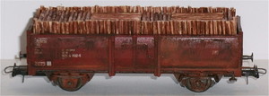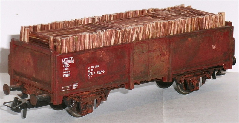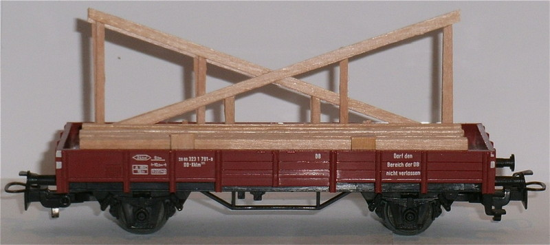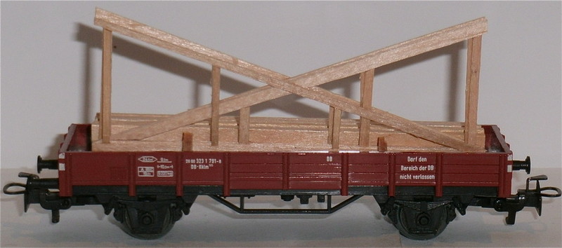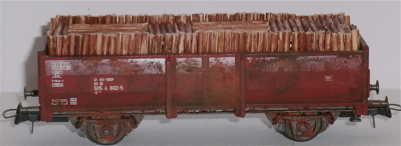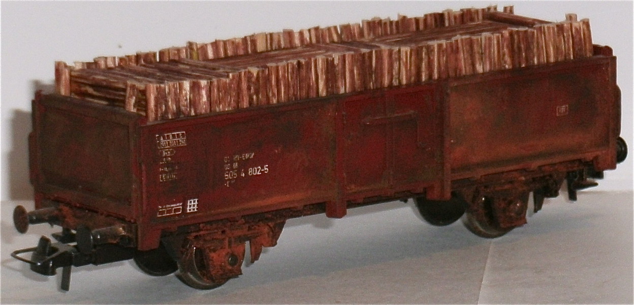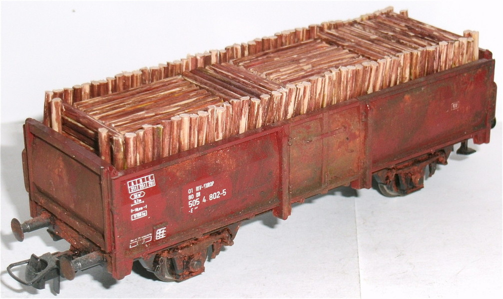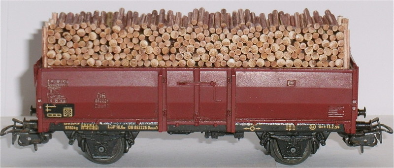 Im Wagen befindet sich ein Block aus Pappe, so dass die stehenden Stämme nur 7mm hoch sind. Die Hauptladung besteht nur aus einer Lage.