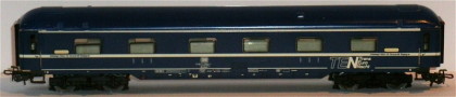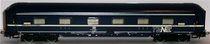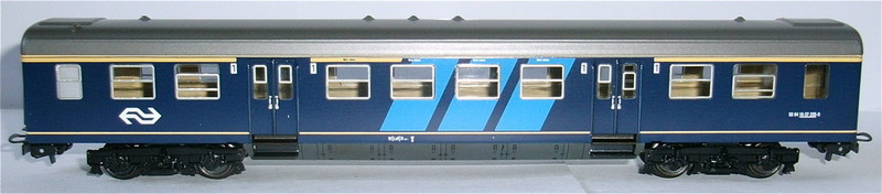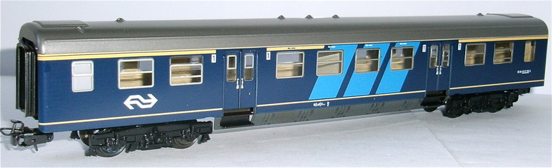 UIC-Aufschriften weiß gedruckt, NS-Logo Doppelpfeil, 3 hellblaue Schrägstreifen, gelbe 1. Kl. Streifen über den Fenstern